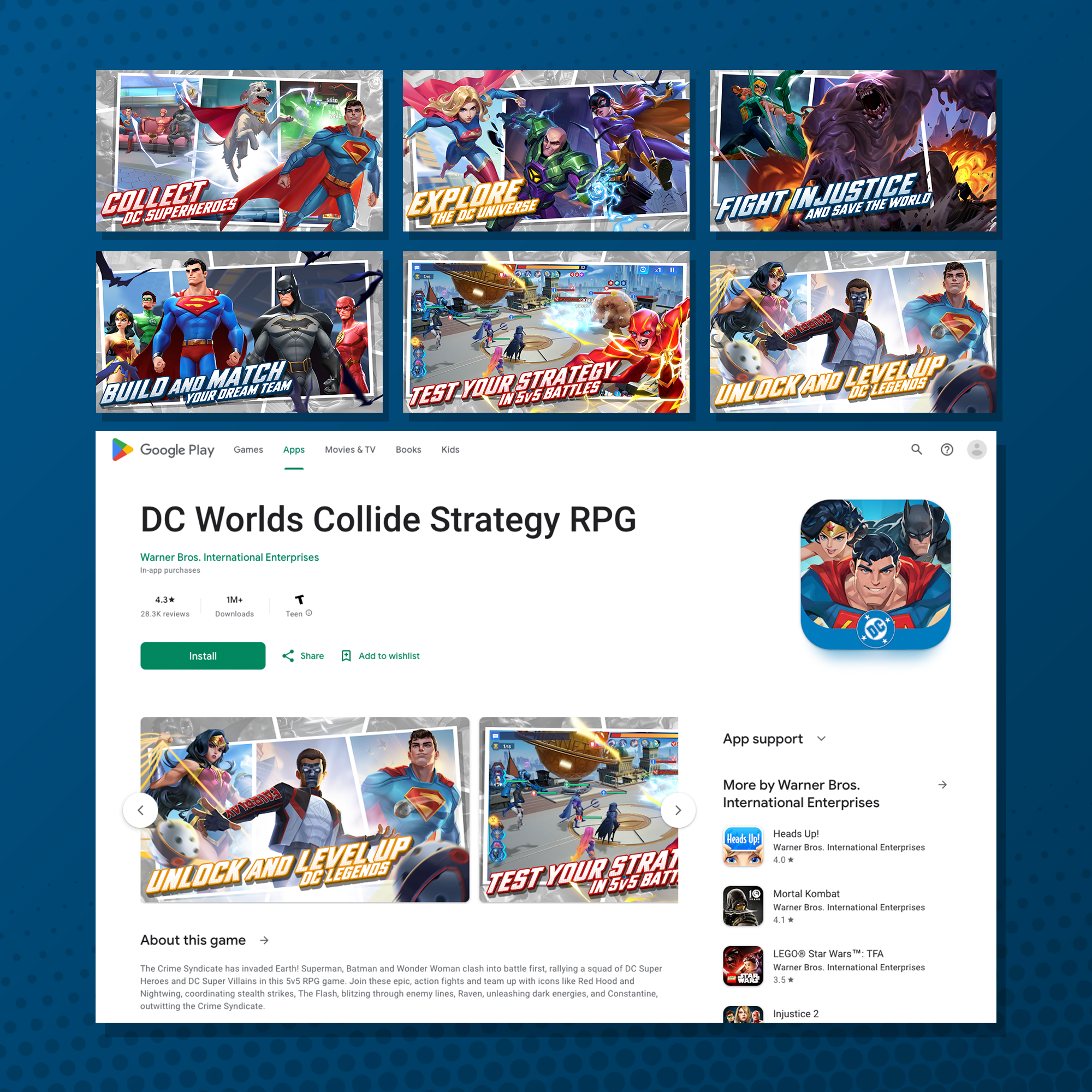 Our colleagues at WB Games San Francisco reached out for support optimizing their first-party App Store screenshots for their latest title, DC Worlds Collide. The goal of this project was to showcase the team’s exceptional DC character art in a more dynamic, high-impact layout that would stand out in a competitive storefront. After a quick concept phase, I proposed a direction that brought the characters to life, literally breaking free from the constraints of their comic panels to create a stronger sense of energy and motion. Once the updated screenshots went live, organic downloads increased significantly.